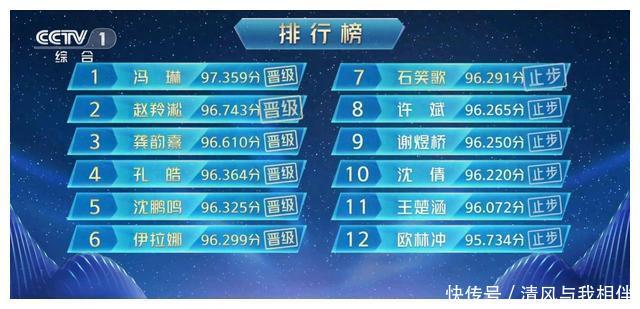 接下来,咱们来望望首场比赛的得分名次。冯琳以97.359分的得益得手,成为了本场比赛的冠军。赵羚淞以96.743分的得益位列第二,龚韵熹以96.610分的得益位列第三。