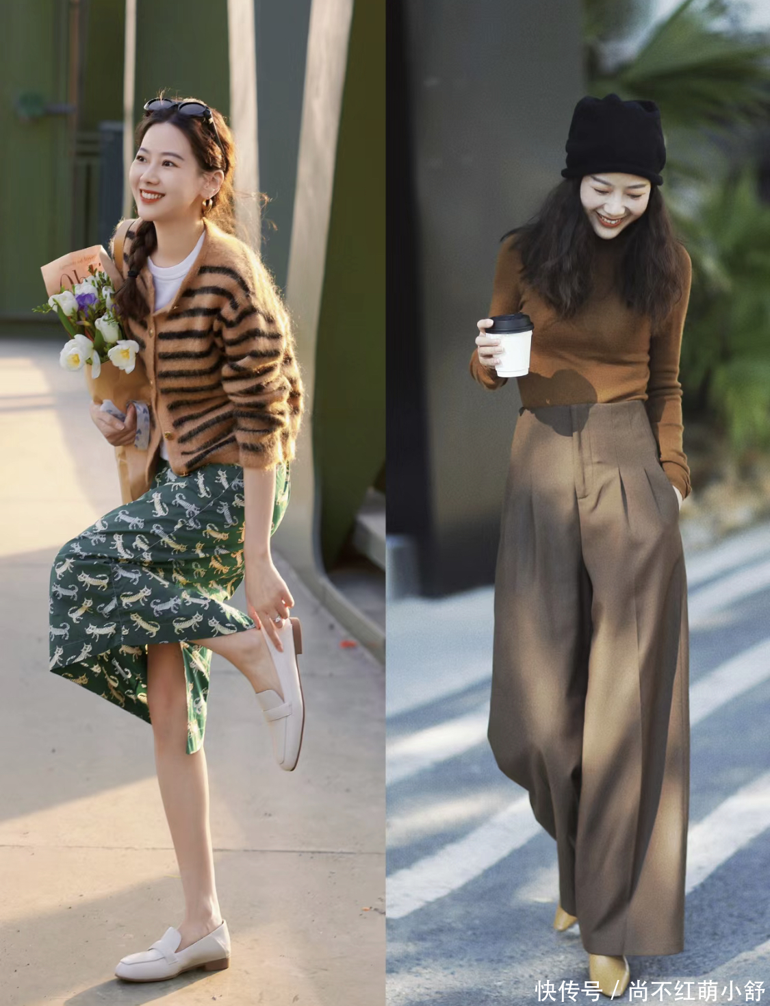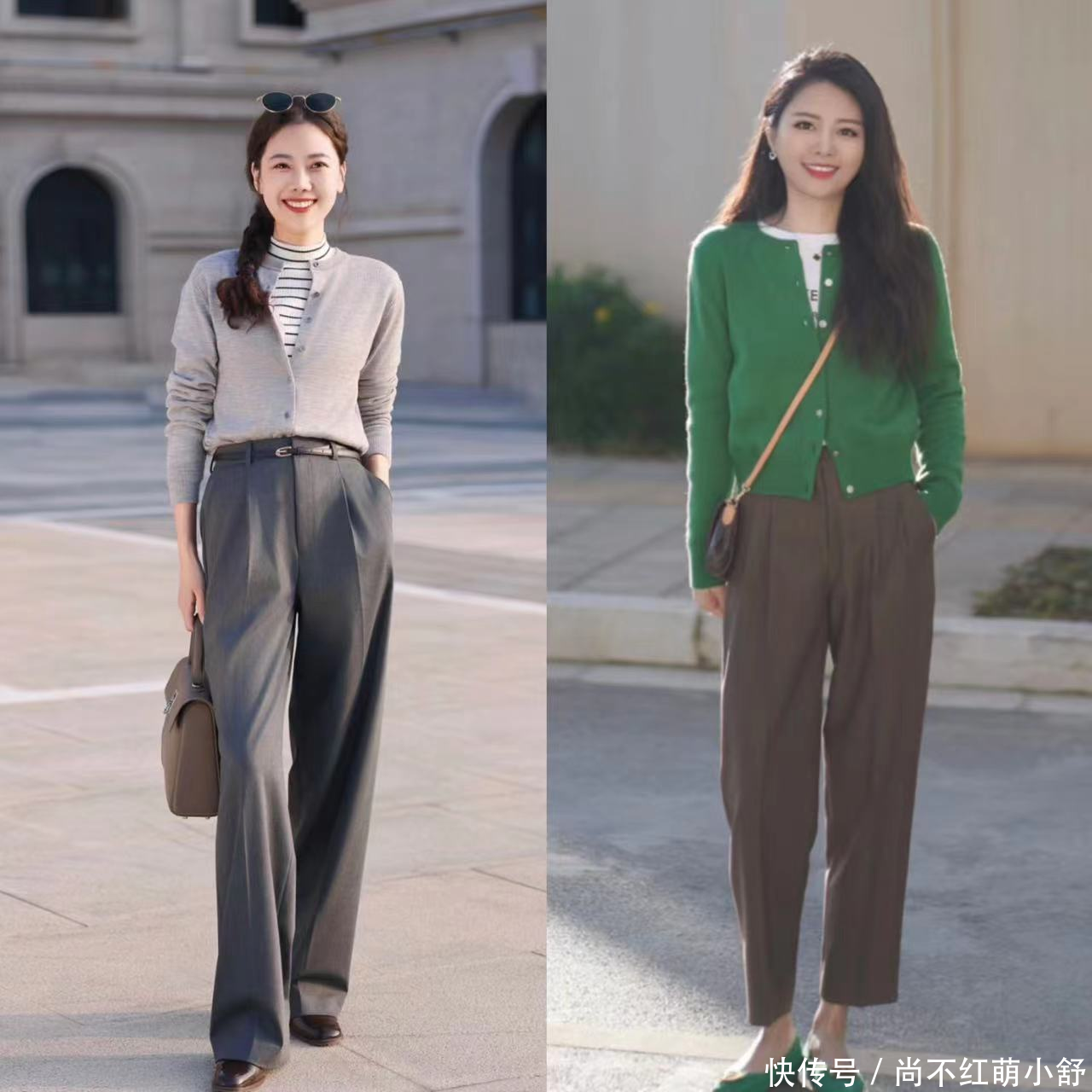 像本年流行的绿色、灰色、红色、白色、玄色竭诚开衫,与裤子进行撞色搭配,亦然妥妥的优雅甜酷风,中年女东说念主就该这么穿。