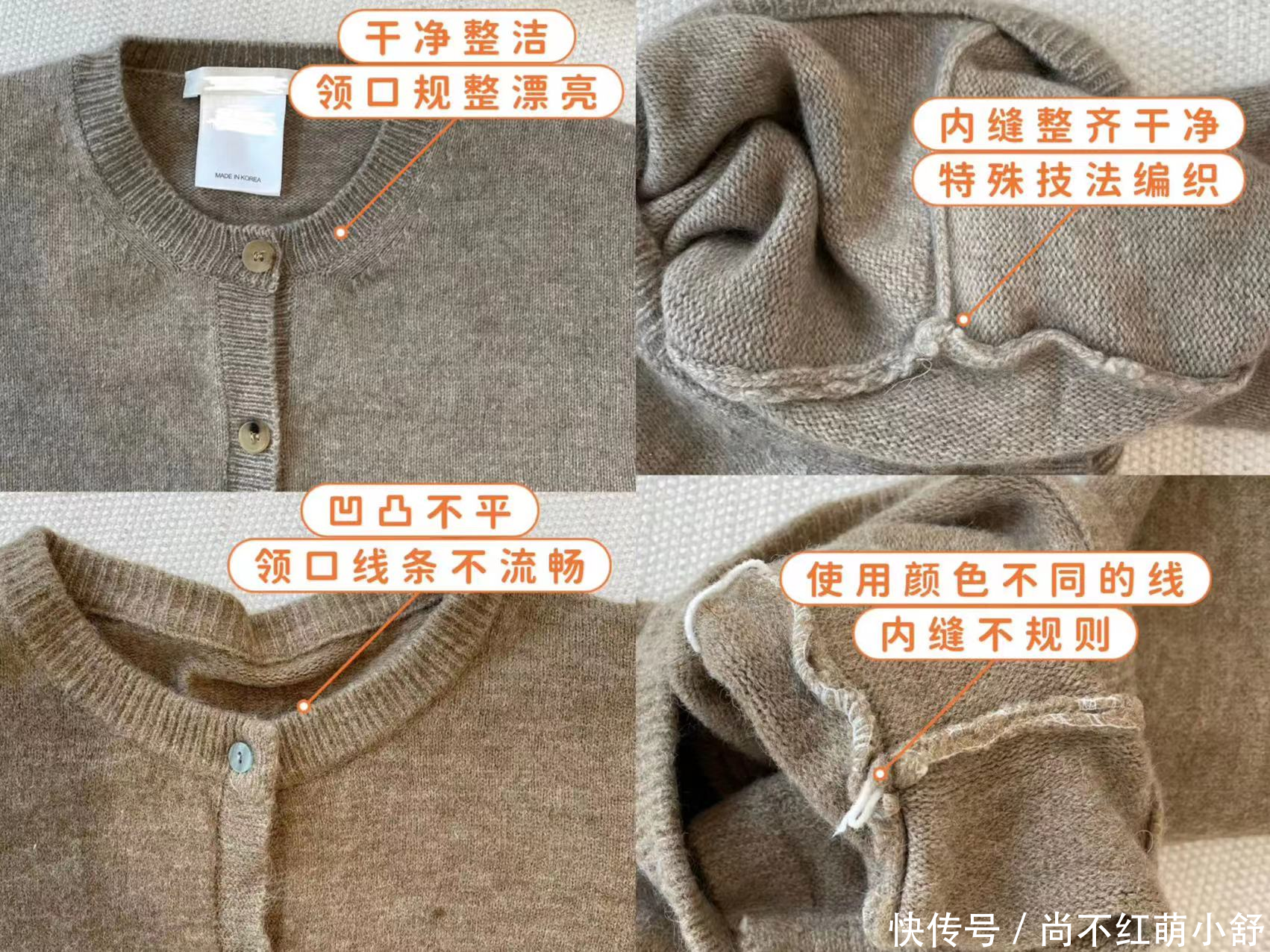 第二步看针线:毛衣的品性,不错通过侧缝、腋下结头等判断,一般荫藏、内缝整都干净的材质品性都偏好,况兼要遴荐领口处的线条要畅达哦。